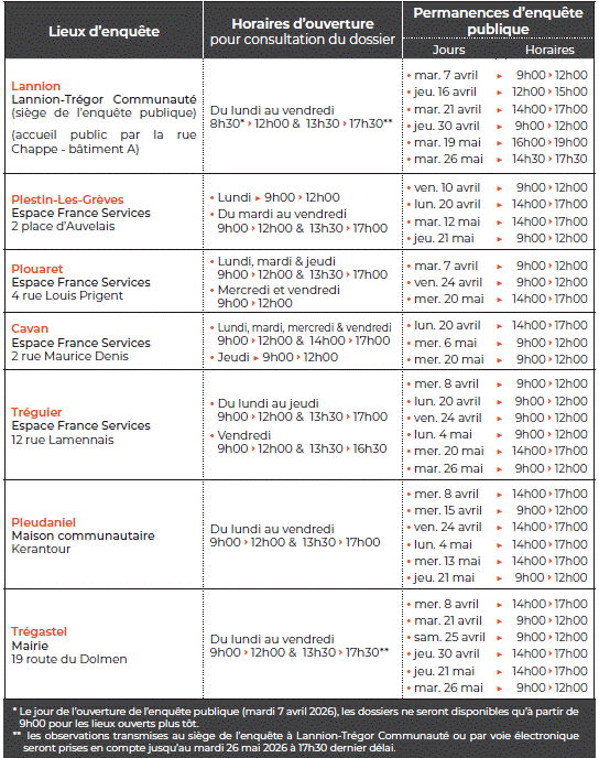A noter que les observations transmises au siège de l’enquête à Lannion-Trégor Communauté ou par voie électronique (selon les modalités décrites plus haut) seront prises en compte jusqu’au mardi 26 mai 2026 à 17h30 dernier délai.
